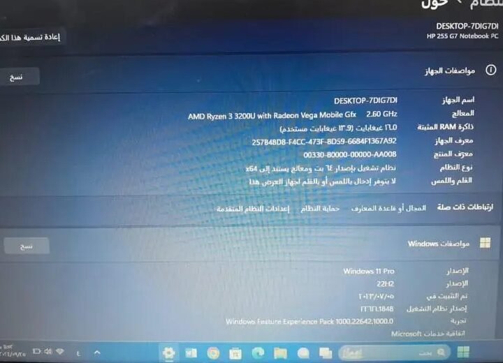 لابتوب HP 255 G7 نوت بوك – AMD Ryzen 3 3200U، SSD، 128 جيجابايت، ذاكرة وصول عشوائي (RAM) 16 جيجابايت، قرص صلب (HDD) 1 تيرابايت، شاشة 15.6 بوصة، Radeon Vega 3، نظام تشغيل Windows 11 Pro